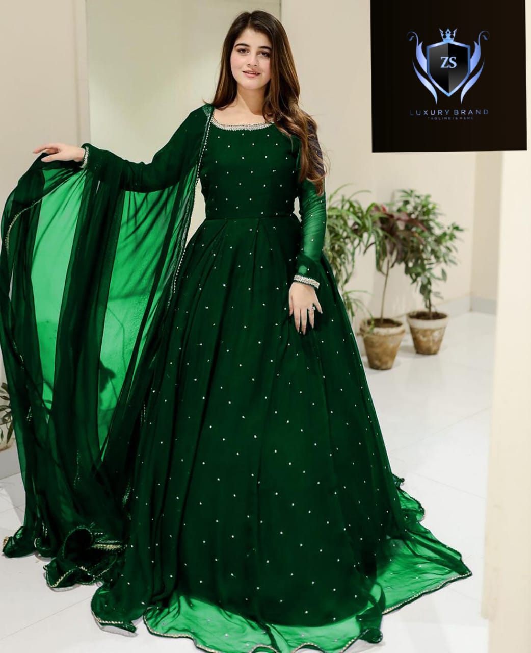 ZS Collection Front And Back Pearls With Lace Work Long Flare Maxi With dupatta 3pcs Chest Size...