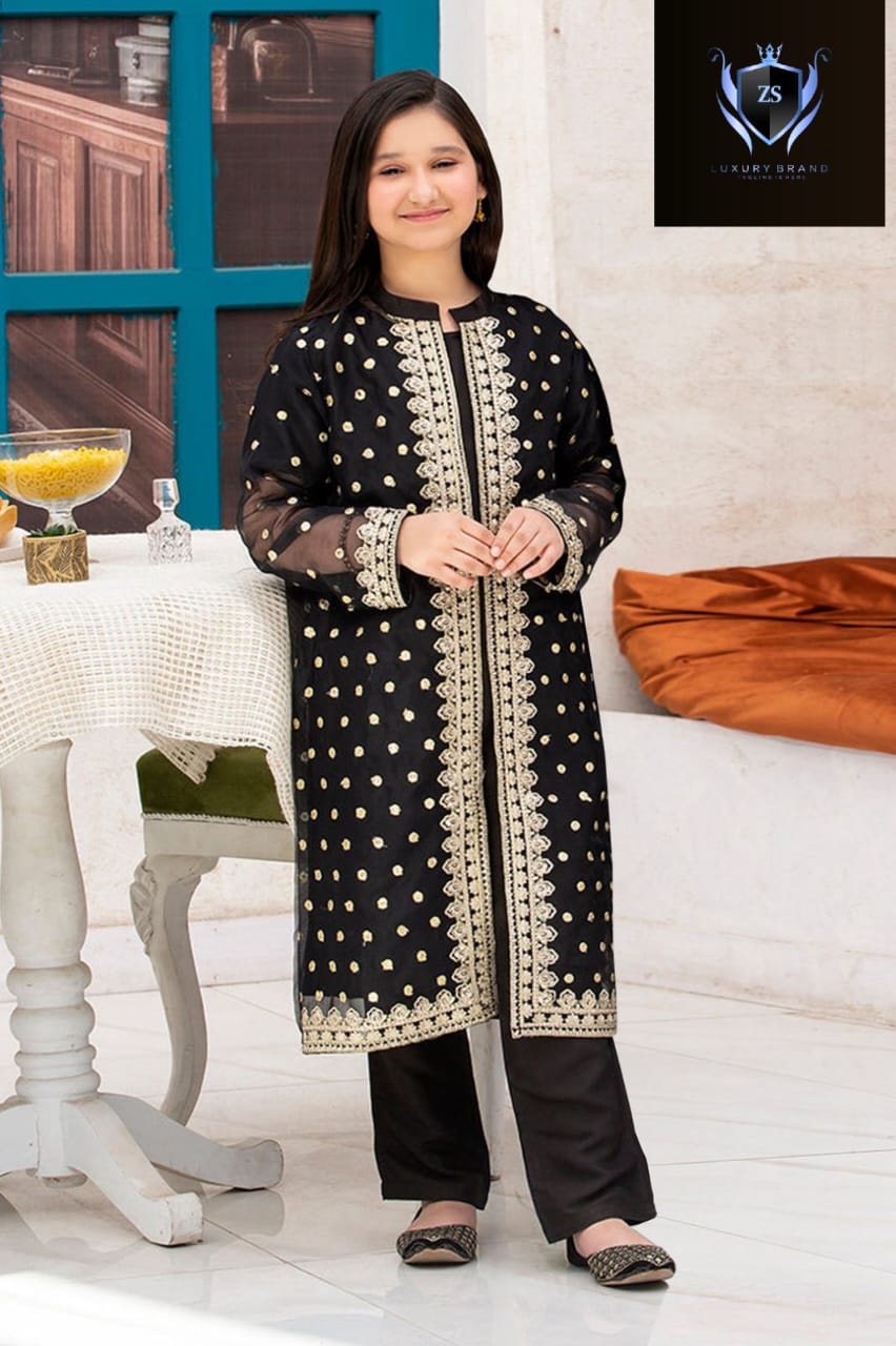 ZS Collection Front Sleeves, Allover Embroidery Gown With Inner Trouser Kids 3Pcs Size Measurements(30 size 6-8 Years)Inner...