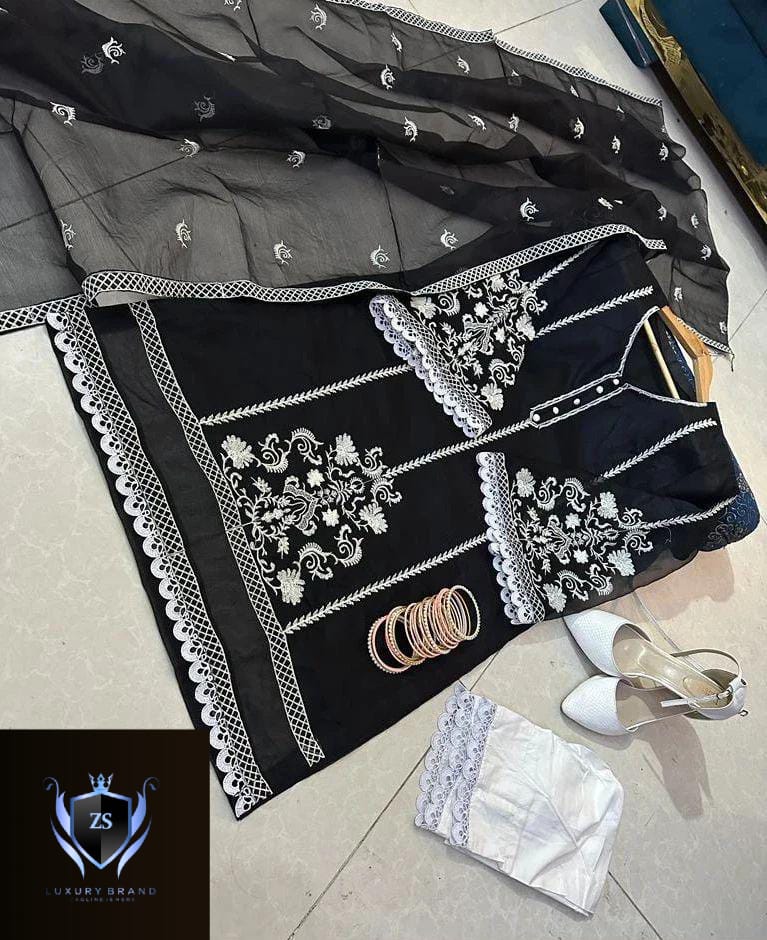 ZS Collection Sleeves, Shirt Embroidered with Lace Attached with Cotton Trouser 3PCs SizeChest 20Shirt Length 37Stuff Organza(Inner...
